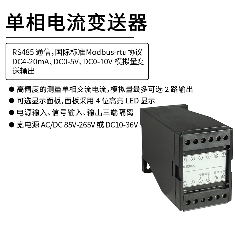 HY194-BS4I單相交流電流變送器,是一種將交流電流信號隔離轉換成線性直流模擬信號輸出或RS485數字通信接口輸出。模擬量輸出最多可選2路輸出,模擬量可選:DC0~20mA、DC4~20mA、DC0~5V、DC1~5V、DC0~10V等變送輸出。RS-485數字通訊接口,采用國際標準MODBUS-RTU通訊協議,可與各種PLC、HMI、組態軟件實現組網;可選顯示面板,面板采用4位高亮LED 顯示,并帶有3個按鍵用來進行參數設置。