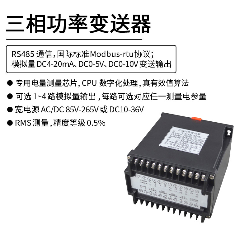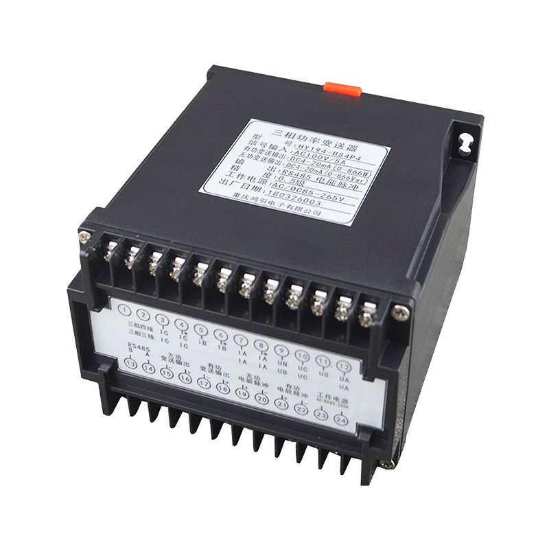 三相功率變送器,通過專用電量芯片采樣,CPU 數(shù)字化處理,真有效值算法,高精度的測(cè)量有功功率、無功功率、視在功率、功率因數(shù)、三相電壓、三相電流、頻率、有功電能、無功電能等,隔離轉(zhuǎn)換成線性直流標(biāo)準(zhǔn)模擬信號(hào)輸出、RS485數(shù)字通信接口輸出或電能脈沖輸出。模擬量可選:DC0~20mA、DC4~20mA、DC0~5V、DC0~10V等變送輸出;RS485數(shù)字通信接口,采用國(guó)際標(biāo)準(zhǔn)Modbus-rtu通訊協(xié)議,可與各種PLC、HMI、組態(tài)軟件實(shí)現(xiàn)組網(wǎng)。最多可選4路模擬量輸出,每路可選對(duì)應(yīng)上面任意一種電參量。有功電能脈沖,無功電能脈沖輸出,脈沖常數(shù)300~9999可設(shè)。