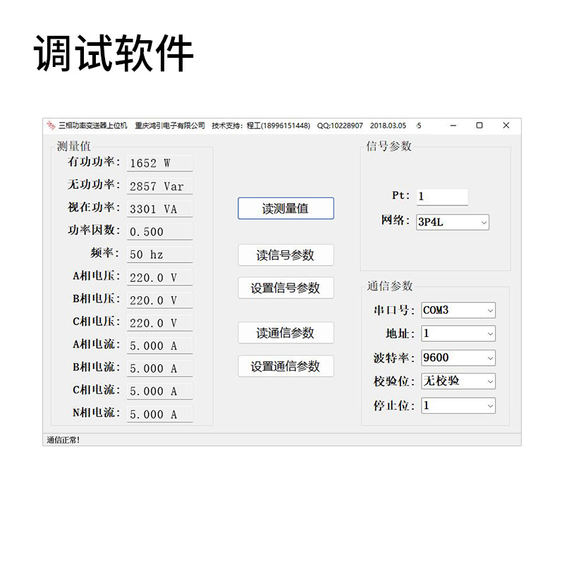 通過上位機(jī)調(diào)試軟件,可以讀出有功功率,無功功率,視在功率,功率因數(shù),頻率,三相電壓,三相電流等;可以設(shè)置電壓電流變比,接線方式,電能脈沖常數(shù);可以設(shè)置電壓變送器的通信地址,波特率,數(shù)據(jù)格式等。