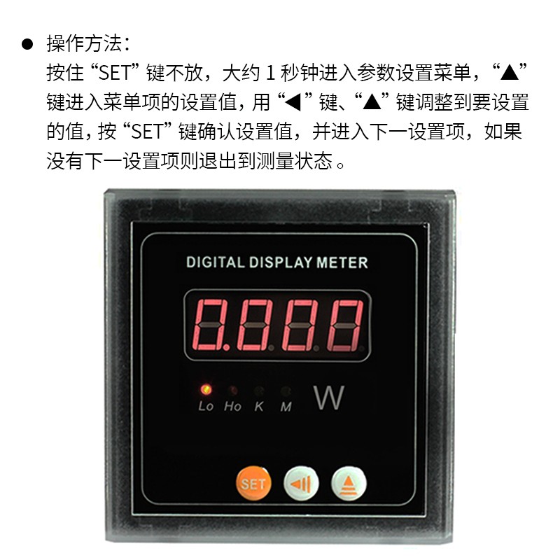 按住“SET”鍵不放,大約1秒鐘進(jìn)入?yún)?shù)設(shè)置菜單,“▲”鍵進(jìn)入菜單項(xiàng)的設(shè)置值,用“?”鍵、“▲”鍵調(diào)整到要設(shè)置的值,按“SET”鍵確認(rèn)設(shè)置值,并進(jìn)入下一設(shè)置項(xiàng),如果沒有下一設(shè)置項(xiàng)則退出到測量狀態(tài)。