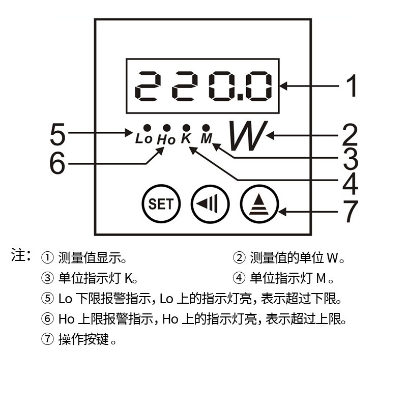 ⑤、Lo下限報(bào)警指示,Lo上的指示燈亮,表示超過下限 。